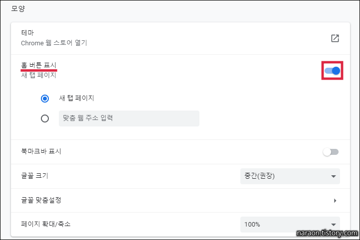 ▲ [홈 버튼 표시] 메뉴의 파란색 스위치를 눌러 해당 기능을 활성화할 수 있습니다. [새 탭 페이지] 로 설정한 경우 홈 버튼을 누르면, 기본 (새 탭)페이지로 이동합니다.