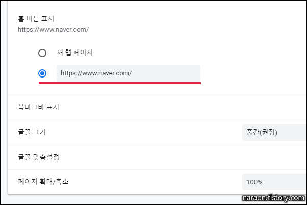 ▲ [홈 버튼 표시] 메뉴의 파란색 스위치를 눌러 해당 기능을 활성화할 수 있습니다. [새 탭 페이지] 로 설정한 경우 홈 버튼을 누르면, 기본 (새 탭)페이지로 이동합니다.