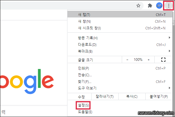 ▲ 우측 상단 [더보기 탭(፧)] - [설정] 메뉴로 이동합니다. 해당 메뉴에서 크롬 관련한 많은 설정을 할 수 있습니다.