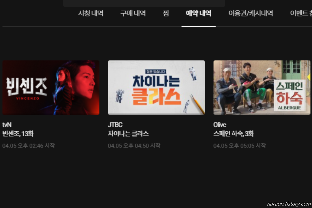 ▲ 홈페이지 우측 상단의 [프로필] - [예약내역] 에서 시청예약 리스트를 볼 수 있습니다. 프로그램 이름과 시작 일자, 날짜 등을 확인할 수 있습니다.