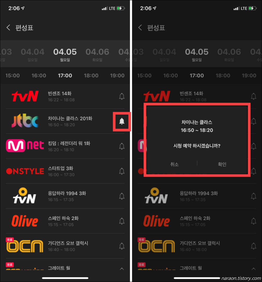 ▲ 시청할 시간대의 프로그램의 종 모양을 누르면 시청예약을 진행할 수 있습니다.