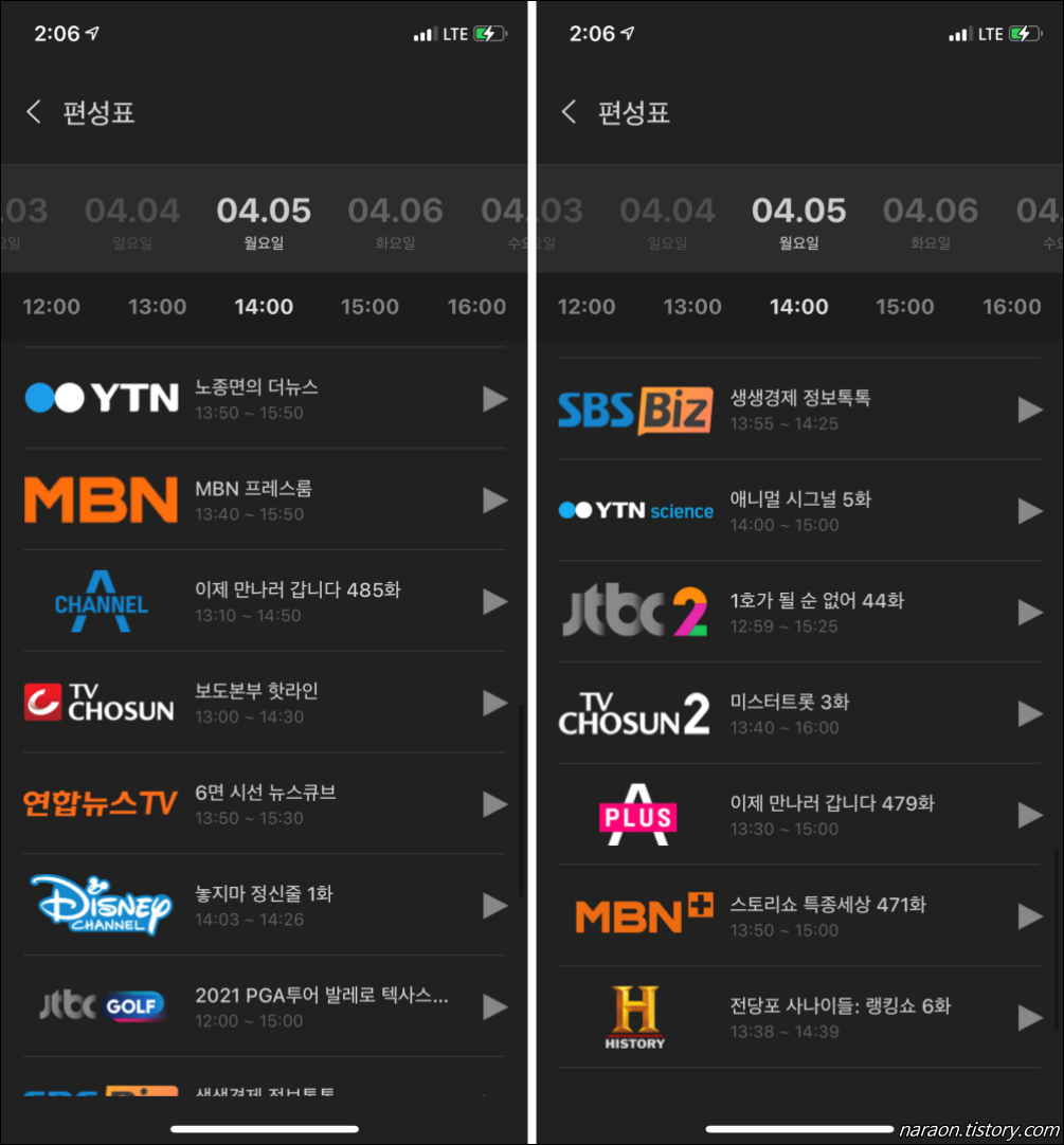 ▲ YTN, MBN, 채널A, TV조선, 연합뉴스TV, 디즈니 채널, JTBC GOLF, SBS BIZ, YTN science, HISTORY(히스토리) 채널의 편성표도 확인할 수 있습니다. 뉴스, 보도 관련 프로그램을 시청할 때 확인해두시면 좋습니다.