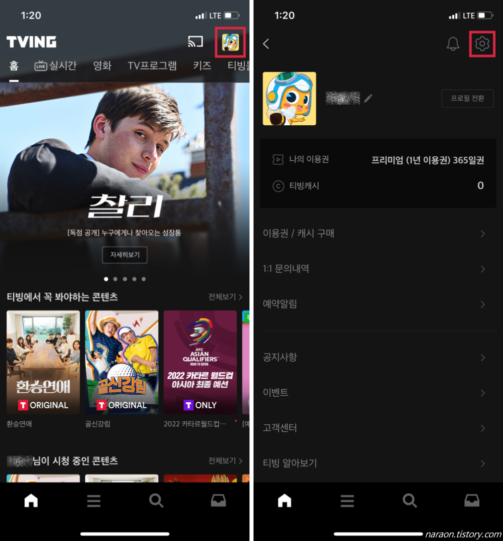 ▲ 티빙 어플 메인화면 우측 상단의 프로필 이미지를 눌러 [마이페이지] 메뉴로 이동합니다. 다시 우측 상단의 톱나바퀴 아이콘을 누르면 [환경설정] 메뉴로 이동합니다.