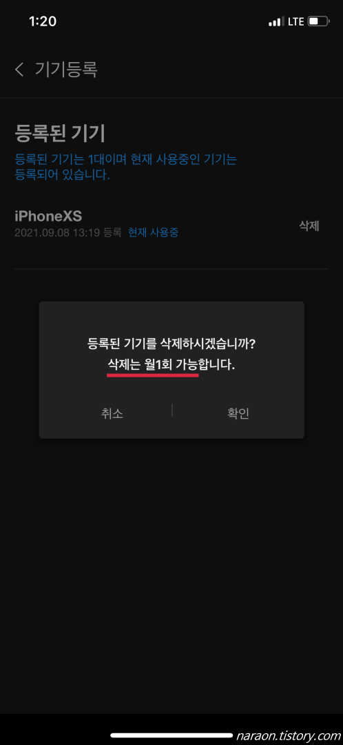 ▲ 기기등록은 최대 4대까지 가능하며, 사용하지 않는 기기는 삭제할 수 있습니다. 다만, 삭제는 월 1회 가능하므로 참고하시길 바랍니다. 기기등록 및 삭제는 PC, 태블릿, 스마트TV 등에서도 동일하게 진행할 수 있습니다.