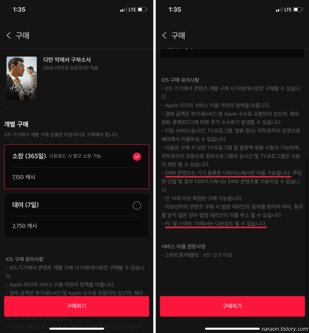 ▲ 영화 구매는 소장(365일), 대여(7일)에 따라 금액이 달라집니다. 아이폰에서는 티빙캐시를 이용하여 구매할 수 있습니다. 영화를 시청할 때는 모바일, PC, 스마트TV, 크롬캐스트 등의 기기가 등록되어야 있어야 합니다.