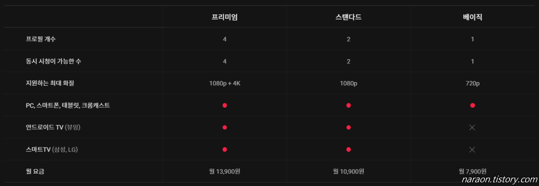 - 프리미엄 : 월 13,900원, 동시시청 4명, 4K 화질, 모든 디바이스
