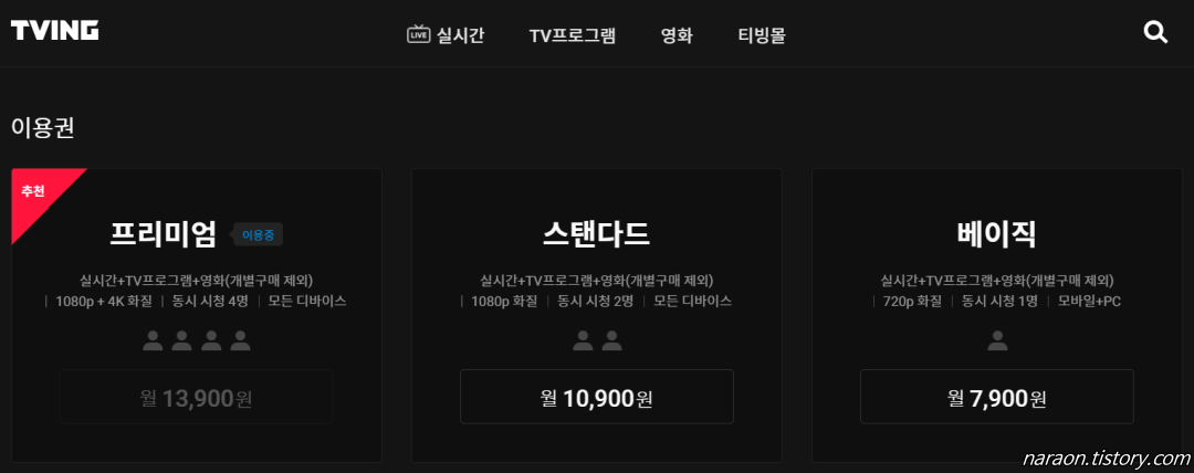 티빙 서비스 초반에는 TV프로그램, 영화 등 컨텐츠 이용에 따라 이용권 가격이 달랐습니다. 티빙 요금제는 2020년 12월 개편을 거치면서 프리미엄, 스탠다드, 베이직 3단계로 심플하게 바뀌었습니다. 이전에 비해서 가격이 오르면서 동시접속(동시시청) 인원에 제한을 두기 시작했습니다.