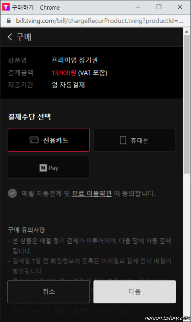 ▲ 이용권 구매는 신용카드, 휴대폰, 네이버페이 등을 통해 진행할 수 있습니다. 구매 시 매월 자동 정기결제가 이루어집니다.