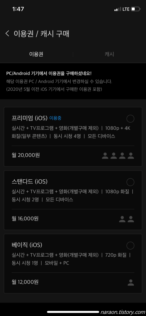 ▲ PC에서 구매하는 이용권도 동일하게 프리미엄, 스탠다드, 베이직으로 나누어져 있습니다. 다만, 가격은 모바일보다 많이 저렴합니다. 요금제별 상세조건을 아래에 정리했는데, 가격을 제외하면 다른 조건은 동일합니다.