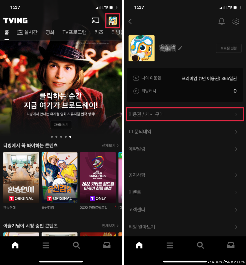 PC(티빙 홈페이지)에서 이용권 구매하기